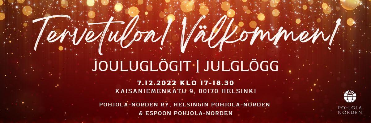 Tervetuloa Pohjola-Norden ry:n sekä Pohjola-Nordenin Helsingin ja Espoon paikallisyhdistysten yhteisille jouluglögeille keskiviikkona 7.12.2022 klo 17–18.30 Pohjoismaiseen kulttuuripisteeseen (Kaisaniemenkatu 9, 00170 Helsinki).