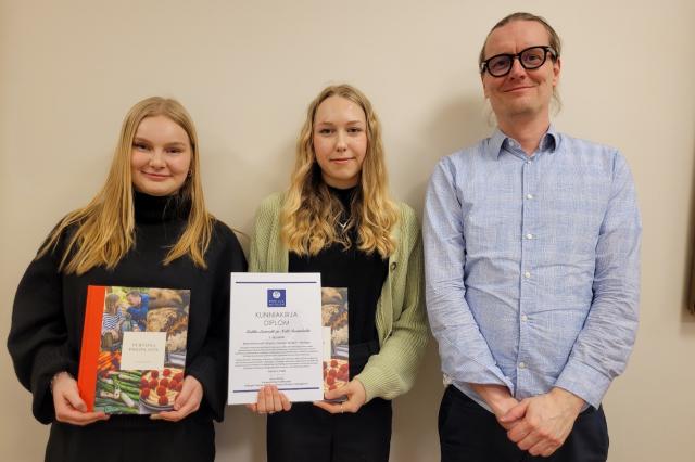 Koulukilpailun voittajat Kukka Lamroth ja Nelli Rantalaiho palkittiin. / Vinnarna av skoltävlingen Kukka Lamroth ja Nelli Rantalaiho belönades. Onnea/grattis!